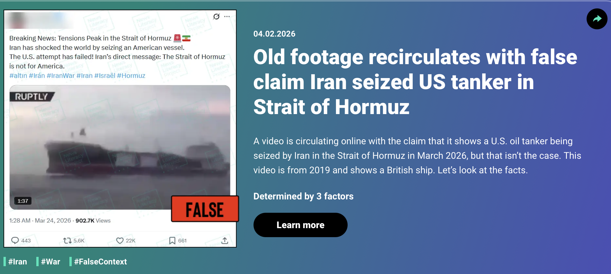 I think RumorGuard is a very helpful tool for learning how to spot misinformation and what factors we need to consider before believing something is real or fake. For example, in one of their cases about a U.S. tanker in the Strait of Hormuz, the platform lays out five key factors to evaluate the credibility of the information: source, evidence, context, authenticity, and reasoning. In that specific example, using the first three factors was enough to identify the claim as false. Overall, RumorGuard is a strong resource because it allows users to interact with real-world examples instead of just reading about misinformation in theory. This makes it easier to understand how misinformation actually appears online and how to evaluate the accuracy of content in a practical way. Below is an example image demonstrating how RumorGuard helps identify misinformation using real-world examples.