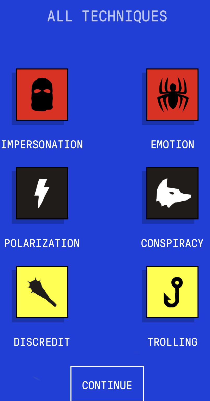 The game has six stages, each focused on a specific misinformation technique: impersonation, emotion, polarization, conspiracy, discrediting, and trolling, as shown in the image to the right. In each stage, you are given multiple options for posts, and your choices affect how your followers react. A meter on the side tracks your follower count and credibility, showing how misinformation can spread depending on the type of content you post. One example from my gameplay was when I impersonated NASA using a slightly altered name like “NÄSA” and posted a false alert about a meteorite. Some users believed the post and reacted with panic, which increased my reach. Overall, the tool teaches how misinformation spreads through emotional content, fake credibility, and audience reactions. Below are two images from the game. The image on the left shows the meter used to track followers, and the image on the right shows how the game allows the player to choose between different tweet options.