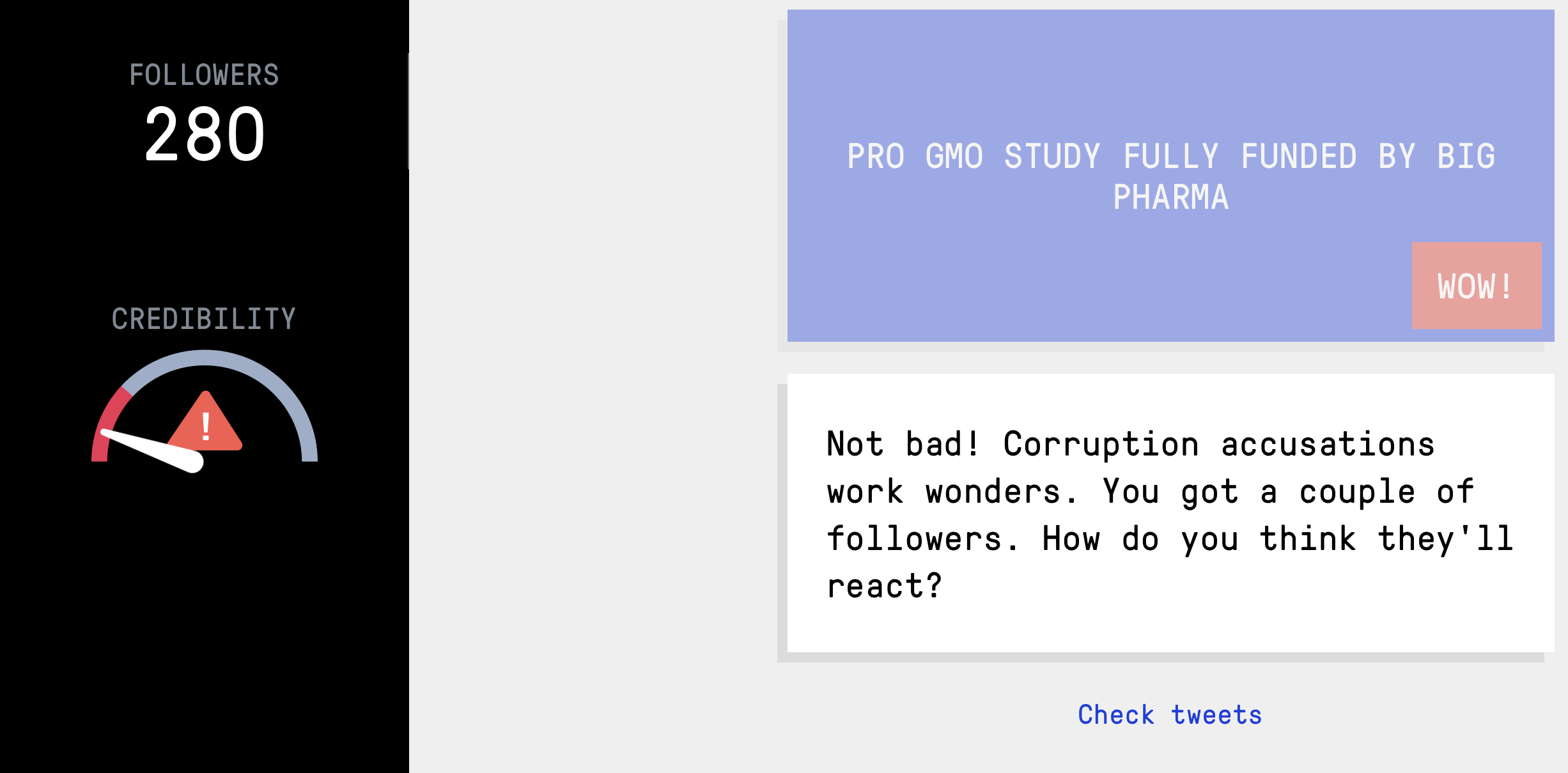 I chose to use Bad News as my tool. It starts with an introductory message that says, “You're here for the position of disinformation and fake news tycoon, is that correct?” The game makes it clear that this is a simulation and not real world posting. It then asks you to post a tweet by choosing from a few options, and based on your choices, you begin to gain followers and influence.